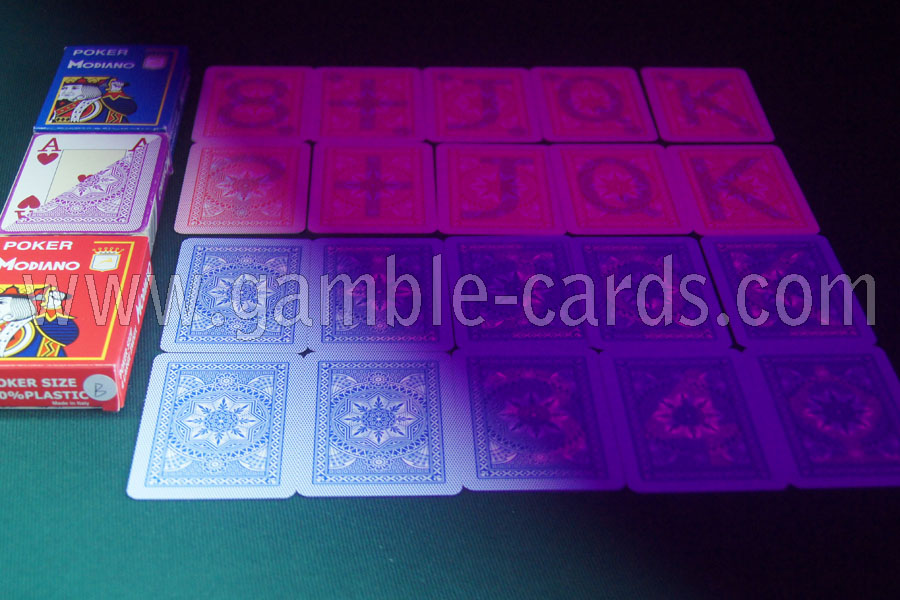 Modiano zdobí luminiscenční markery jsou speciálně navrženy pro velkou show! Modiano karty jsou 100% plastové hrací karty často trvá až 50 100 krát více, než je papír nebo plast potažené hrací karty. 100% plastové karty jsou omyvatelné, křída a vyblednutí odolný, vodotěsný a velmi odolný.